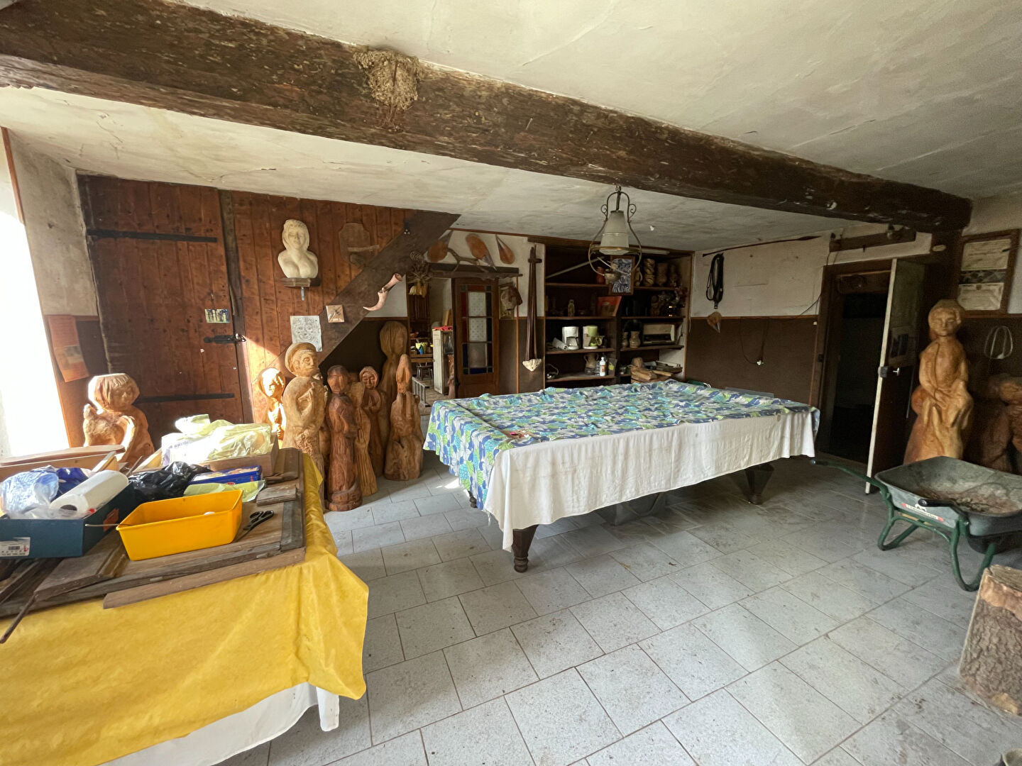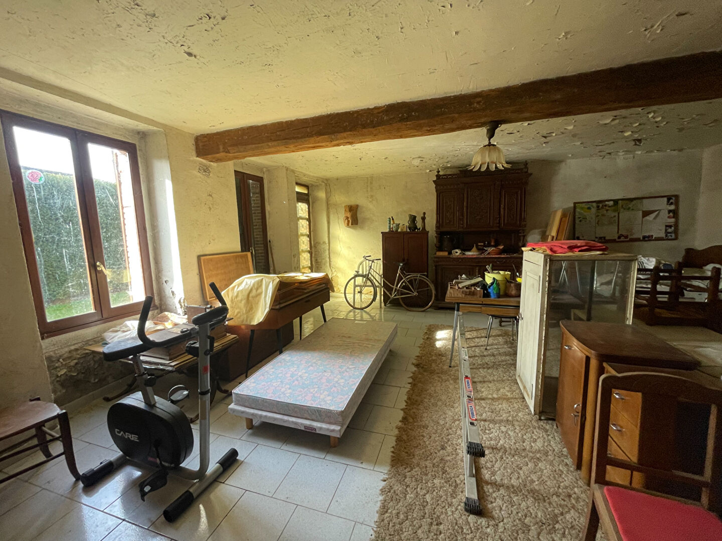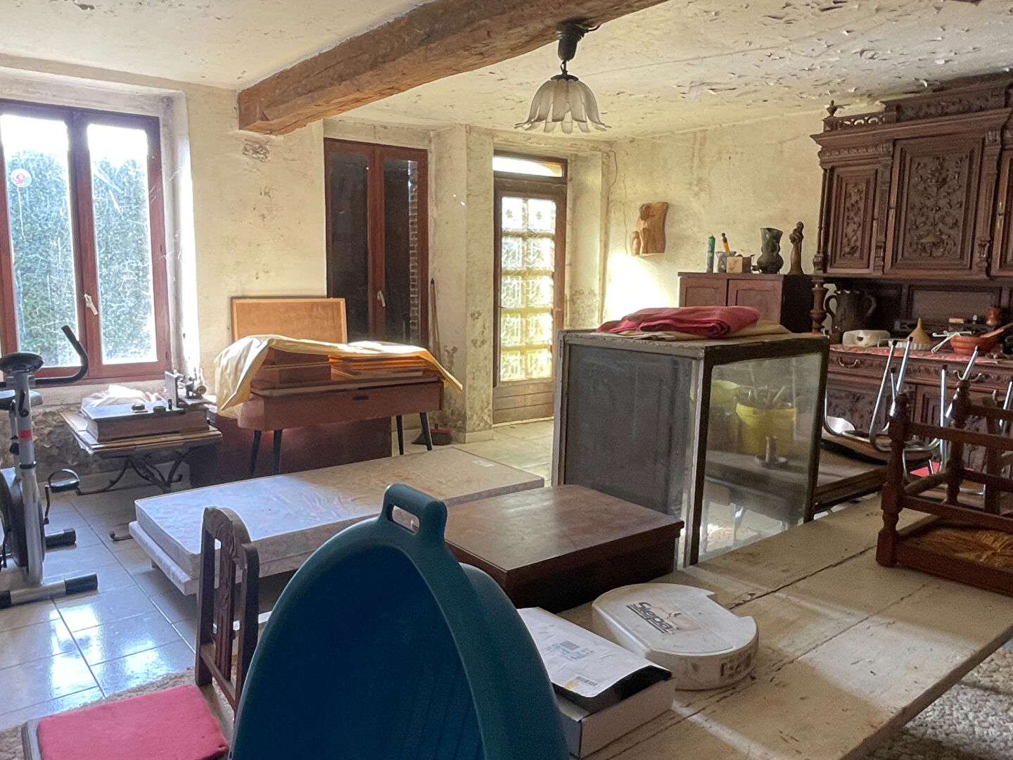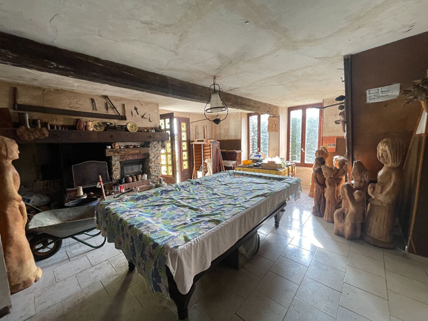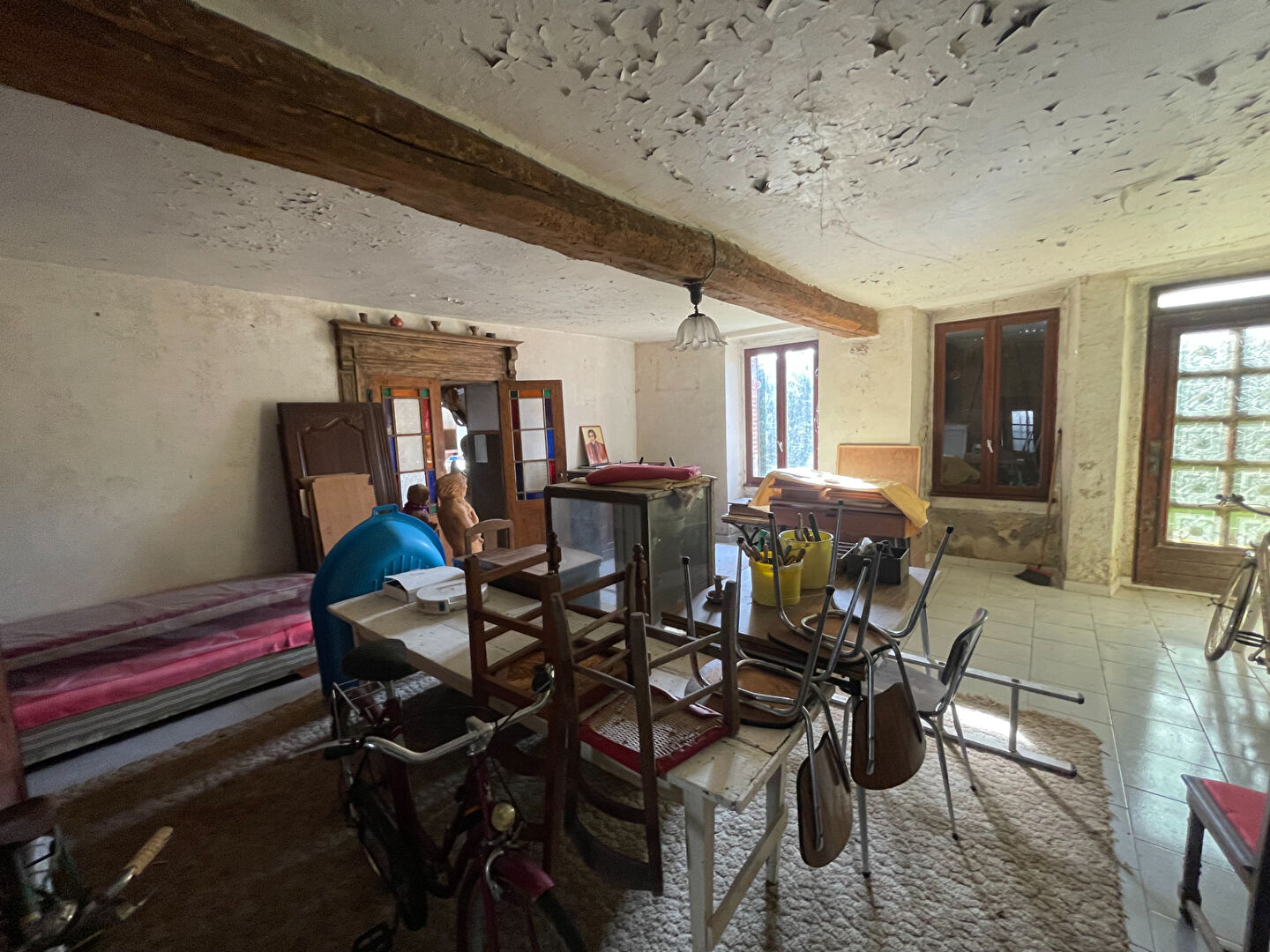Entrée sur salon, salle à manger avec cheminée foyer ouvert+ insert. Une pièce à usage de cuisine, une pièce avec point d'eau WC.